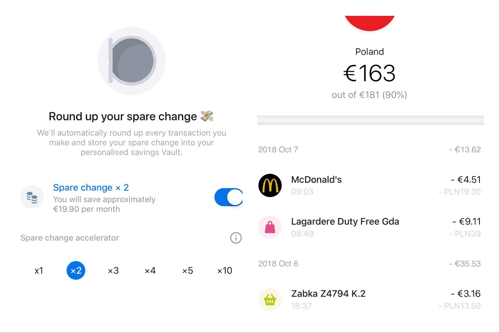 If you find you struggle to save, then this would be a very good feature for you! Revolut have these things called “Vaults” that you can set up to save money in, almost like a virtual piggy bank. They also have the option to round up your spare change so that each time you use your Revolut card, they’ll round it up and put the difference into your vault automatically for you. You can also set up a certain amount to save each day/week/month too, so for example I have it set up that I put €10 into my vault every week.