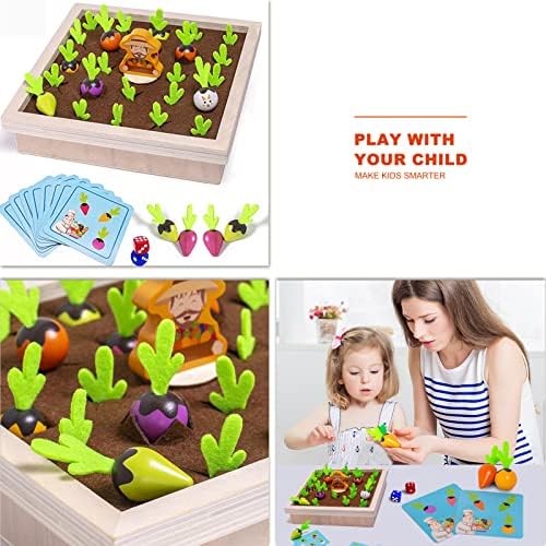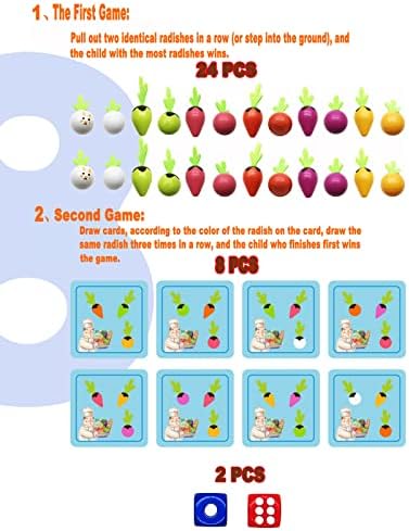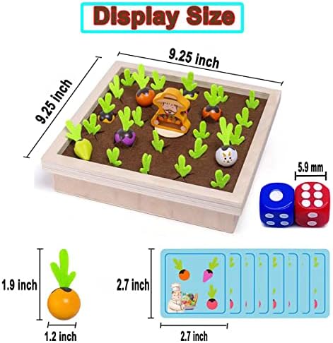 【 FUN SORTING GAME】: 24 carrots of different colors and sizes, 2 game dice, 8 memory cards, 1 wooden farmer, 1 wooden box, the wooden box has 24 holes to insert the carrot product size: 9.40X9 .30X2.36( inches)