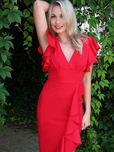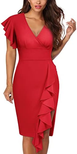 Knitee Women’s Deep-V Neck Ruffle Sleeves Cocktail Party Pencil Slit Formal Dress