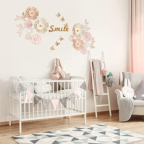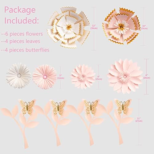 Mverse Handmade Paper Flowers Set with Leaves and Butterflies, 14 Pc. Kit, Elegant Wall Decorations for Nursery, Wedding, and Baby Shower Decor, Pink and White Floral Pastel Colors