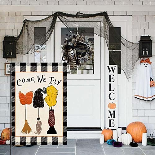 ORTIGIA Halloween Hocus Pocus Witch Garden Flag Double Sided Sanderson Sisters Vertical 12×18 Inch Buffalo Check Plaid Witch Broom Yard Flag Seasonal Flag Halloween Fall Farmhouse Seasonal Holiday Yard Décor