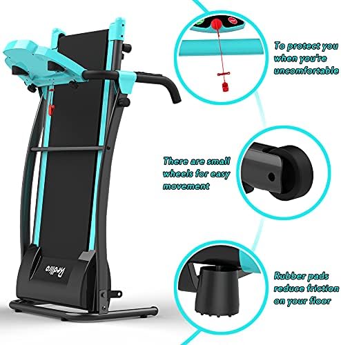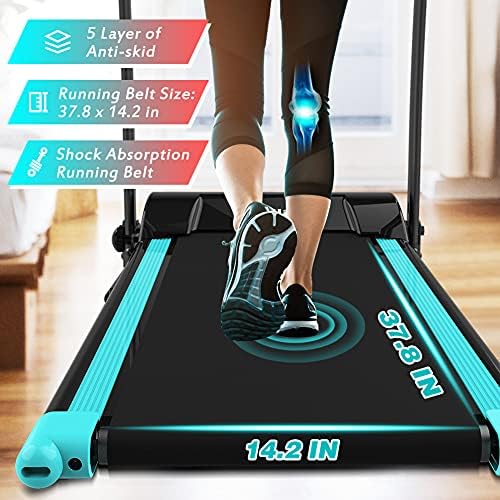 【Home Treadmill-Unique Color Design】: We have chosen a beautiful cyan, which is a rare color on the market. And this home treadmill runs very smoothly, its running belt size is 37.8 *14.1 inches, which makes it very suitable for home use. When you don’t want to do too tired exercise, walking briskly on this electric treadmill is a good choice. [no incline]