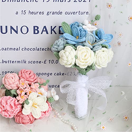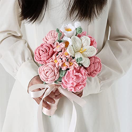 Wedding Romantic Bouquet Bridal Bridesmaid Bouquet Handmade Crochet Flowers Arrangements for Home Garden Party Wedding Decoration (Pink)